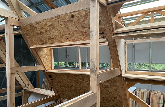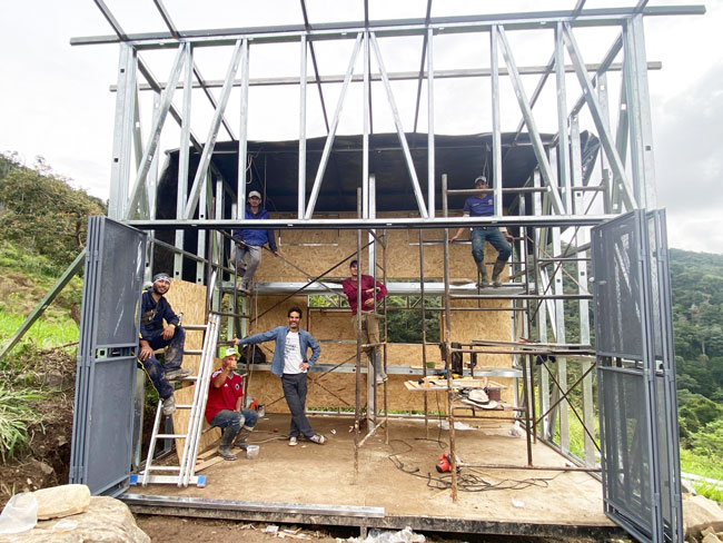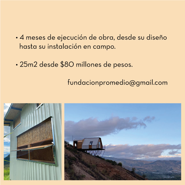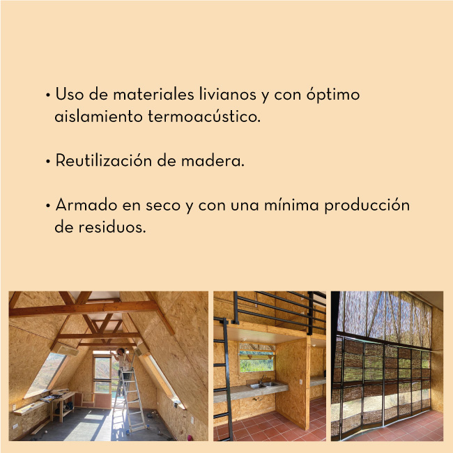 Para el proceso de construcción utilizamos materiales ultra livianos con propiedades de aislamiento termoacústico y recuperamos madera de pino. En su armado no usamos agua, ni generamos residuos. El tiempo de ejecución de una CASA PARA LLEVAR de 25 m2, desde las actividades para su cocreación, la prefabricación en el taller de Fundación Promedio, y la instalación en campo con todos los acabados es de 4 meses.