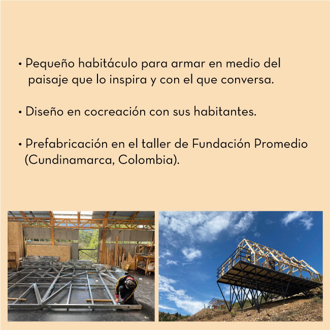 CASA PARA LLEVAR es un sistema de arquitectura modular desarrollado a partir de un proceso de cocreación con sus futuros habitantes. La etapa de prefabricación tiene lugar en el taller de Fundación Promedio y toma estructura, forma y función en un proceso de armado en seco en el ecosistema que inspira su diseño único.