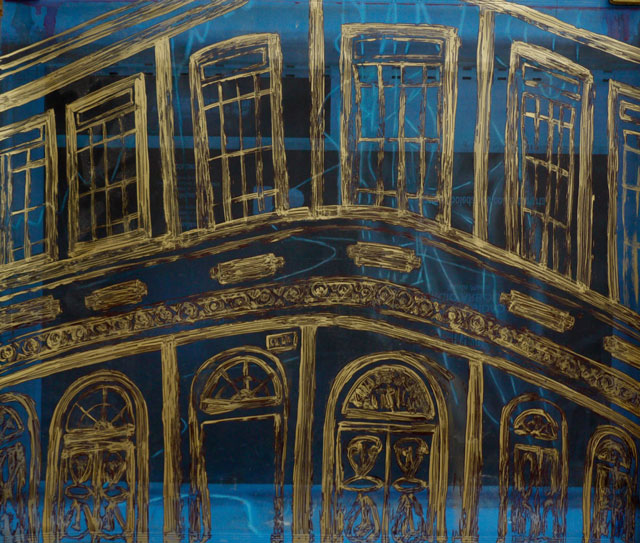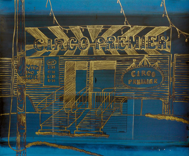 Reutilizando mantillas provenientes de la industria gráfica como soporte, esta serie pictórica se vale de los rastros del proceso de impresión para la composición de imágenes con acrílico dorado y tinta negra.