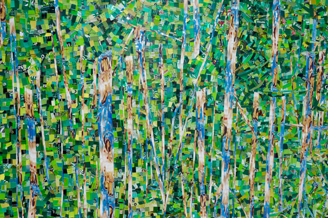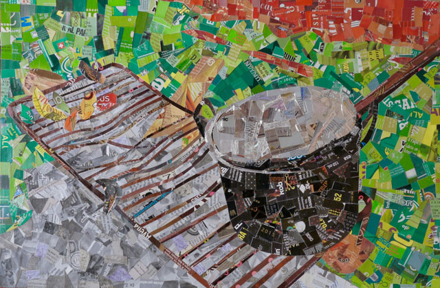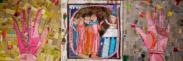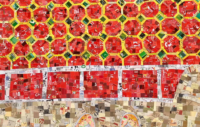 Pedazos de empaques rescatados de la basura, recortados y pegados sobre cartón reutilizado.